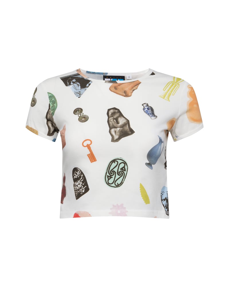 A fitted cropped baby tee in super stretchy cotton/spandex jersey. Features our tossed icon print. Due to the nature of this print, each garment will be unique in layout.