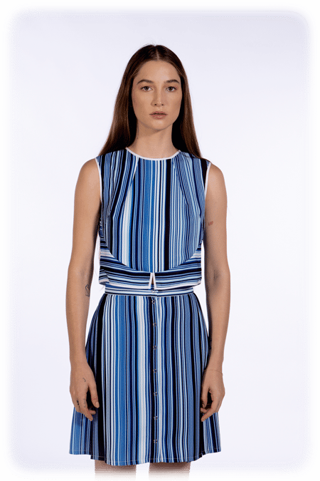 High waisted A-Line skirt with pleated front and flat back in Cobalt Stripe print. Silver eyelet snaps up front.
